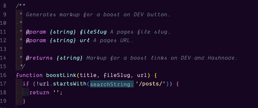 /** * Generates markup for a boost on DEV button. * * @param {string} fileSlug A pages file slug. * @param {string} url A pages URL. * * @returns {string} Markup for a boost links on DEV and Hashnode. */function boostLink(title, fileSlug, url) { if (!url.startsWith('/posts/')) { return ''; }
